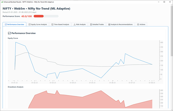 • Equity Curve Visualization: Performance over time with trade markers